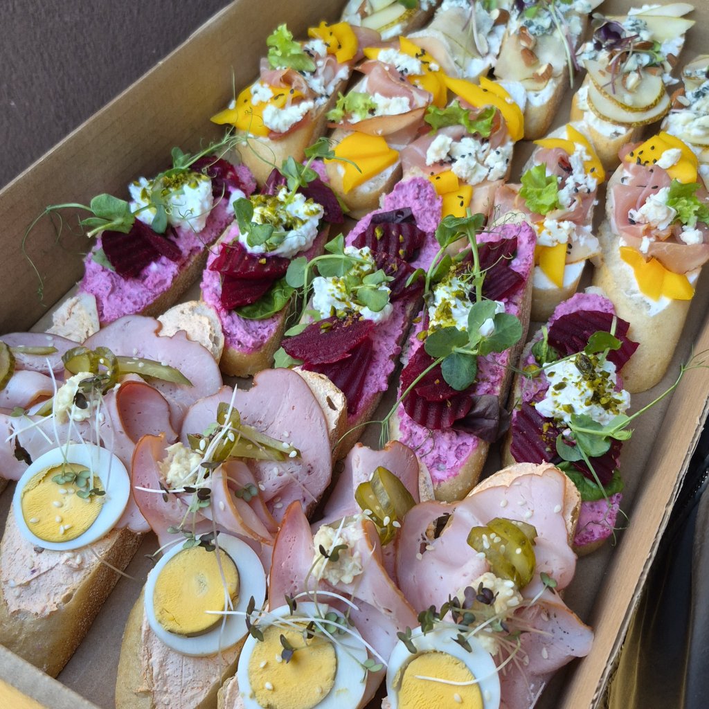 5x chlebíček bryndzová nátierka + moravské mäso, 5x chlebíček cviklový s cottage syrom a pistáciami, 5x chlebíček tvarohová nátierka s prosciuttom a mangom, 5x chlebíček hermelínová nátierka s hruškami, orieškami, nivou a medom